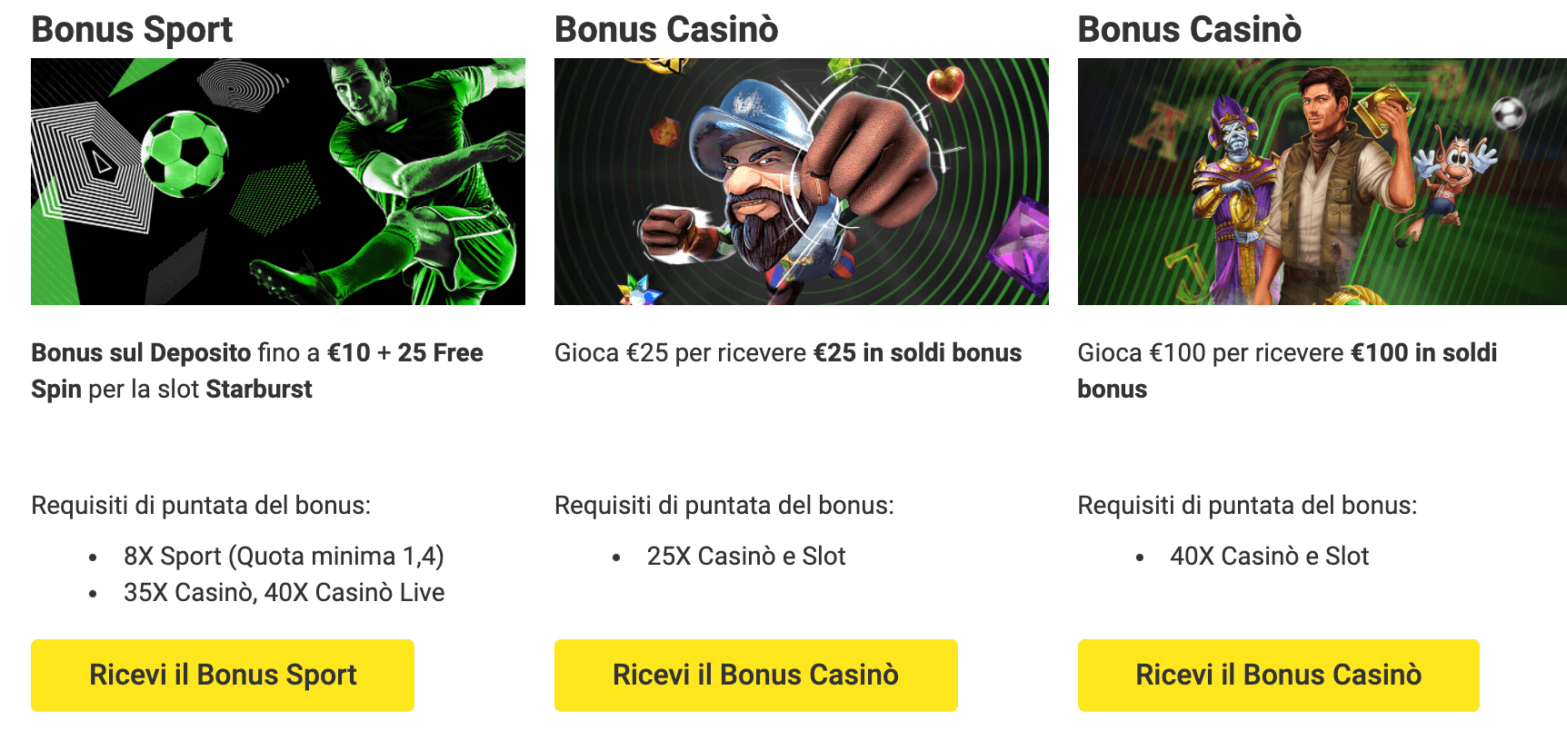 Tra di essi, troviamo: un bonus di benvenuto sport o casino corrispondente a 10 euro di bonus a cui si aggiungono 25 free spin o un bonus sul deposito pari al 100% fino ad un massimo di 500 euro, il bonus “Invita un amico – Sport” tramite il quale è possibile ottenere un bonus Sport che può arrivare a raggiungere i 100 euro e, infine, un bonus scommessa multipla tramite il quale sarà possibile ottenere 10 euro di bonus nel caso in cui, piazzando una quintupla da dieci euro, se perdi una sola partita, ne vinci il doppio.
